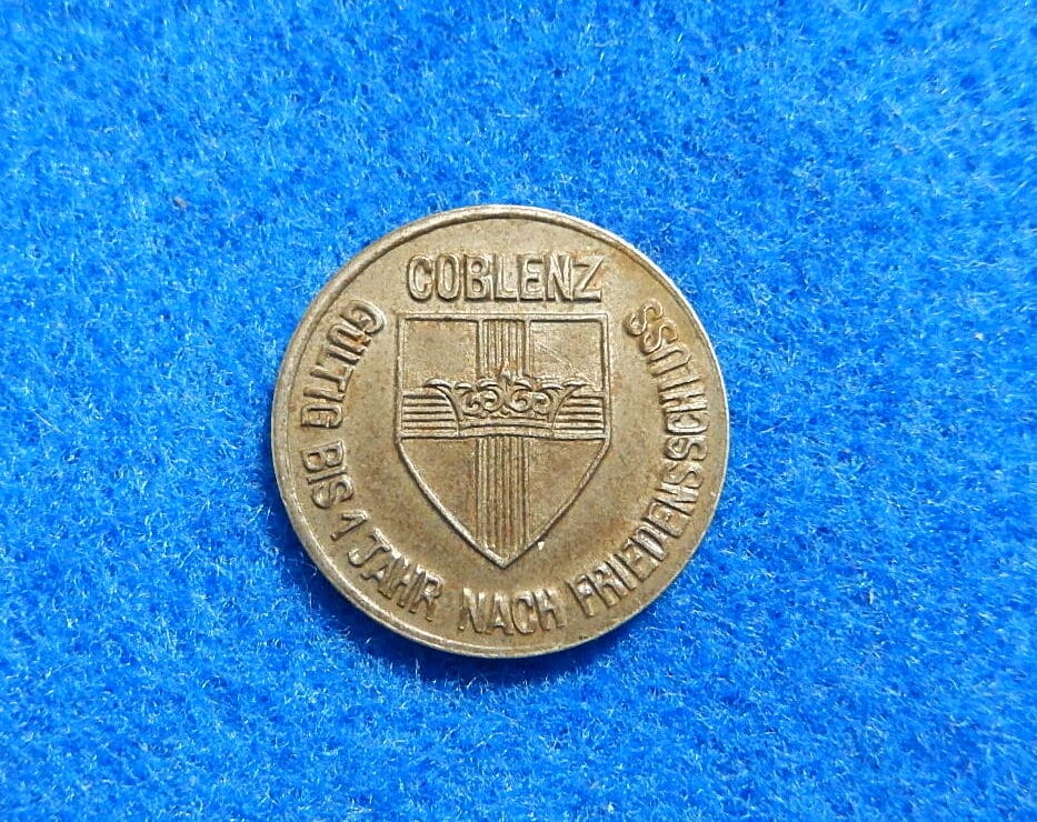 1918 GERMANY – CITY OF COBLENZ (after 1926 spelled Koblenz) – original 10 Pfennig NOTGELD/KRIEGSGELD COIN from WW1 era. Made of 20.2mm diameter iron. Shipped in coin flip holder from Lexington, KY. You will receive the exact coin pictured. We ship in one business day. JBvalu Stock no. NGC-3. Flat shipping charge to USA includes tracking.