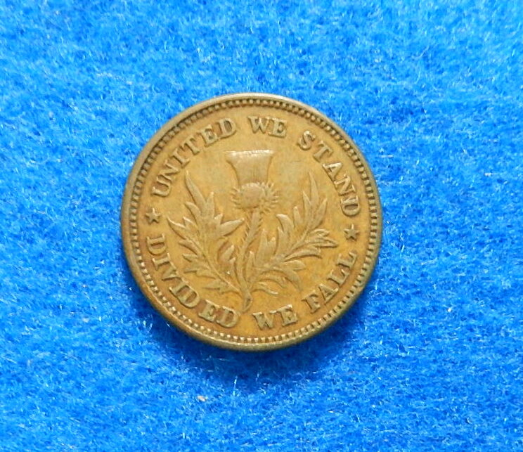 A rare original 1860’s Civil War Merchant Token/Store Card/Patriotic token, approx. 19mm diameter copper. Great details. Obverse: “UNITED WE STAND – DIVIDED WE FALL”. Reverse: “DRUGS, DRY GOODS, GROCERIES, HARDWARE & NOTIONS”. Token a little darker in person due to photo lighting. Shipped in a coin holder. Own a piece of Civil War times history. You will receive the actual token pictured. JBvalu Stock no. CW-36. Flat shipping charge to USA regardless of quantity or additional items includes tracking.
