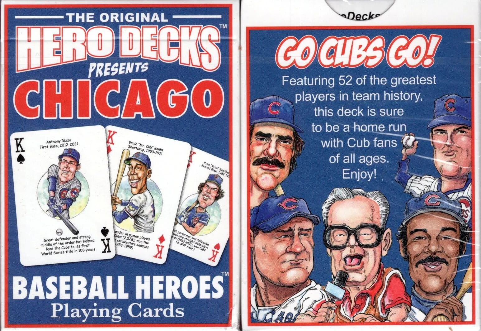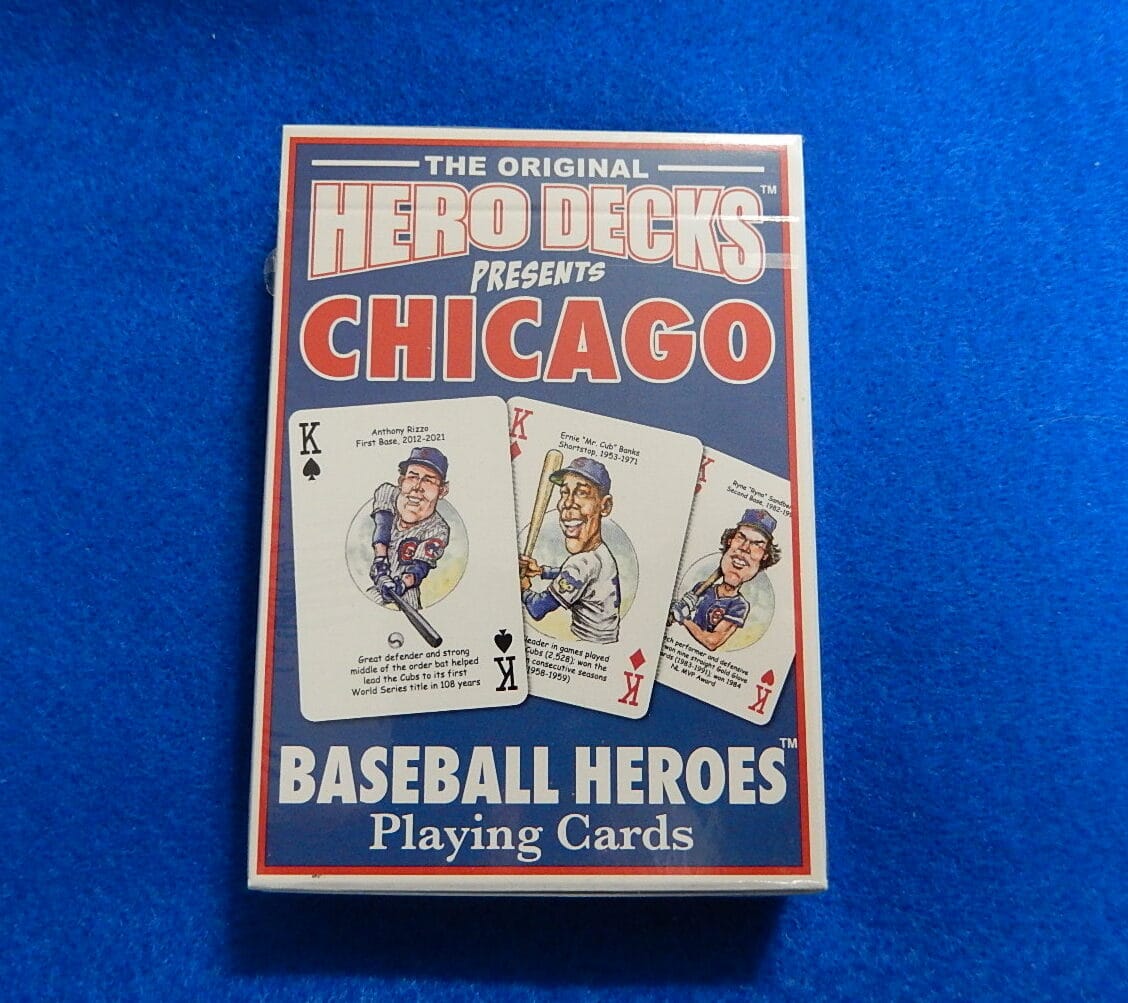 The Cubs Baseball Hero Deck playing cards for Chicago Cubs fans feature fifty-two of the greatest players by position and era in Chicago Cubs baseball history. Thoughtfully organized by position using baseball numerology, the face of each playing card is colorfully illustrated with a different hero … this deck is sure to be a HOME RUN with Cubs fans of all ages! The popular playing cards are made in the USA, poker-sized and casino-quality, plus each card features original artwork. They are a “must have” for sports fans! We ship within one business day. JBvalu Stock no. W-HeroCubs. Flat shipping to USA regardless of quantity or additional items includes tracking.
