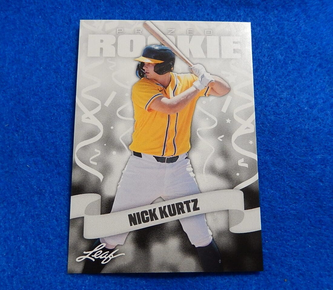 Original NICK KURTZ 2024 LEAF Prized Rookie Baseball Card #16. JBvalu Stock no. NK7. Near Mint. A great Kurtz collectible. Ships in soft plastic sleeve inside a hard plastic top loader. Flat shipping charge to USA regardless of quantity or additional items includes tracking.
