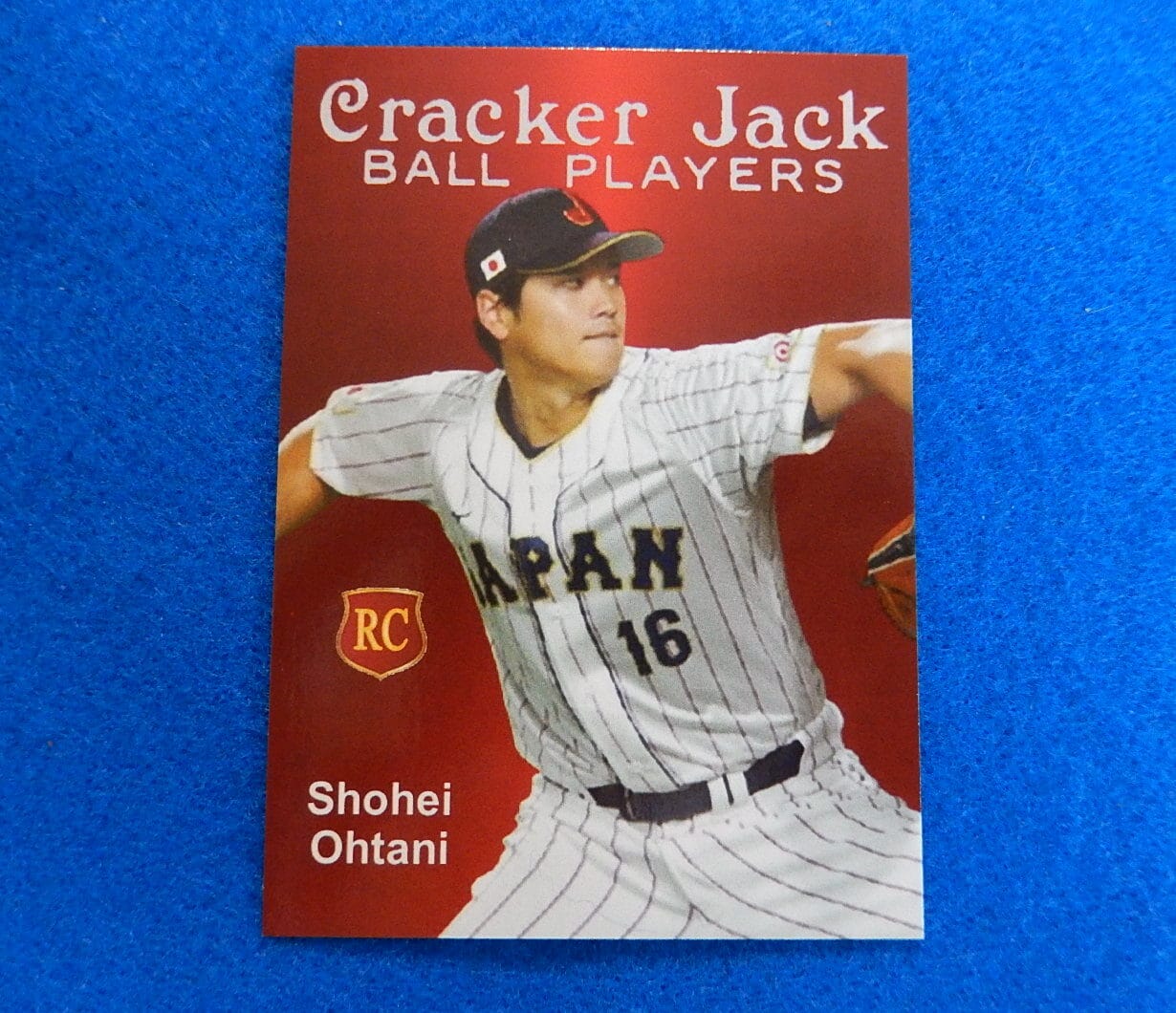 A great SHOHEI OHTANI Cracker Jack Ball Players Rookie Baseball Card, Japan Jersey version. Near Mint condition. This version of Cracker Jack card is standard trading card size (2-1/2″ x 3-1/2″). Great looking and affordable Shohei collectible. JBvalu stock number SO89. Card ships in soft plastic sleeve inside a hard plastic top loader. Flat shipping charge to USA regardless of quantity or additional items includes tracking.