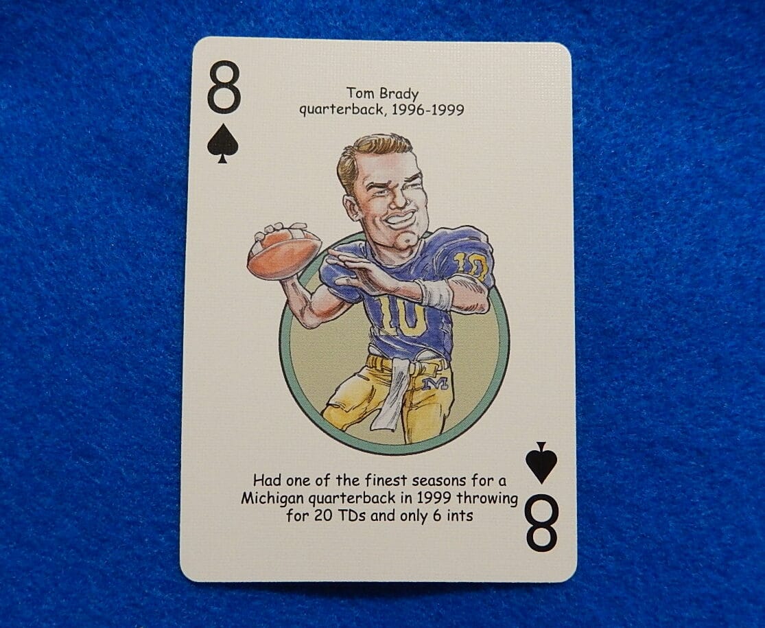 Original Tom Brady MICHIGAN Wolverines “8 of Spades” Hero Decks Playing/Trading Card in Near Mint condition. JBvalu stock no. TB16. Shipped in soft plastic sleeve inside hard plastic top loader. We ship within one business day. Flat shipping charge to USA regardless of quantity or additional items includes tracking.